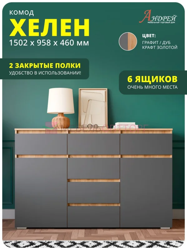 Хелен КМ 05 Комод 6 ящиков (1502х958х460) серый графит/дуб крафт золото - сборка под ключ! Хотите купить мебель «Хелен КМ 05 Комод 6 ящиков (1502х958х460) серый графит/дуб крафт золото» сейчас, но у вас нет такой суммы? Приобретайте его в кредит или рассрочку! Читайте честные отзывы про мебель «Хелен КМ 05 Комод 6 ящиков (1502х958х460) серый графит/дуб крафт золото» фабрики ТДАнд.