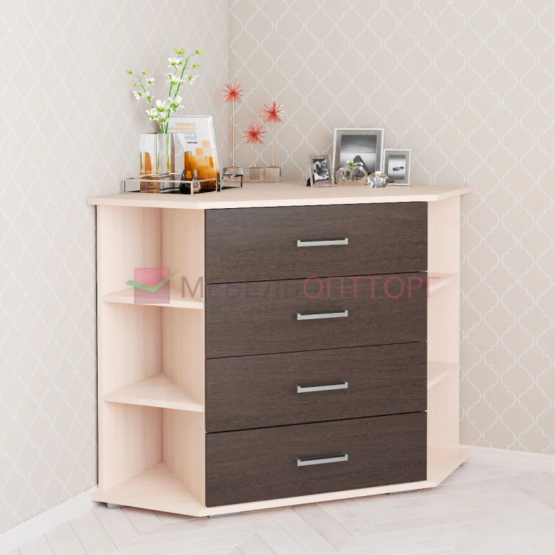 Угловой комод с открытыми полками и выдвижными ящиками.