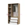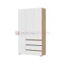Трёхстворчатый шкаф Хелен ШК 06 с двумя распашными створками неполной высоты, открывающиеся захватом снизу, укомплектованы хромированной штангой для одежды. В нижней части шкафа — три ящика полного выдвижения. Боковая секция модуля в виде глухого пенала открывается с помощью отталкивателя и оснащена полками.