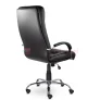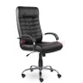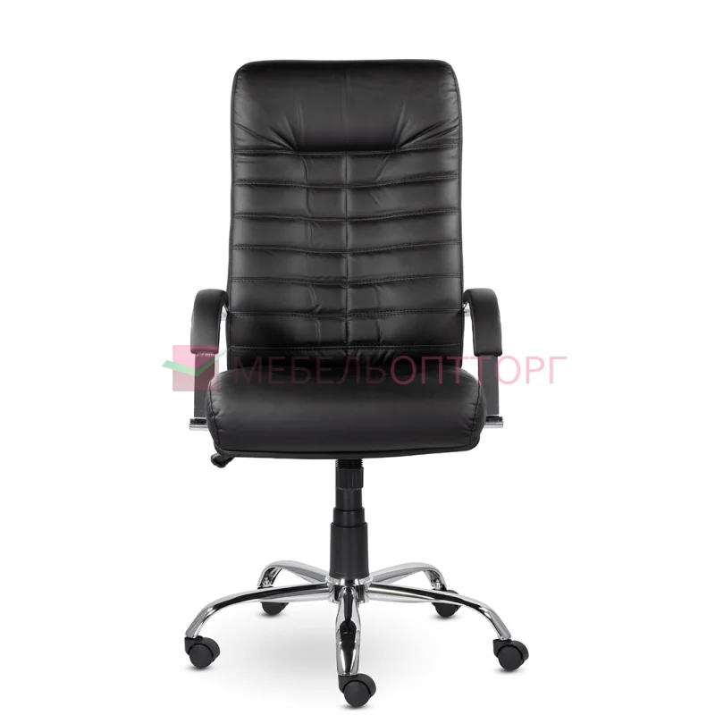 Массивное кресло руководителя с горизонтальными прострочками по ширине всей спинки и углублением. Хромированные подлокотники с мягкими накладками, возможность синхронно отклонять спинку и фиксировать сидение в рабочем положении. Максимальная нагрузка - 120 кг