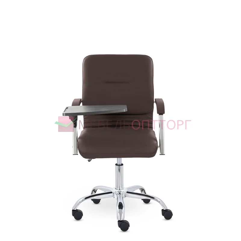 Улучшенная комплектация кресла включает горизонтальные прострочки, соединяющие спинку и сиденье, что придает креслу современный нео-классический стиль. Удобные накладки обеспечивают комфортную поддержку рук и способствуют их расслаблению. К креслу прилагается столик, выполненный из пластика. Модель отлично подойдет для конференц-залов, переговорных, актовых залов.
