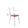 Воздушная модель стула имеет интересный дизайн спинки, представляющую собой крестообразное пресечение нескольких металлических нитей, образующих в центре маленькие ромбики. Каркас стула выполнен из хромированного металла