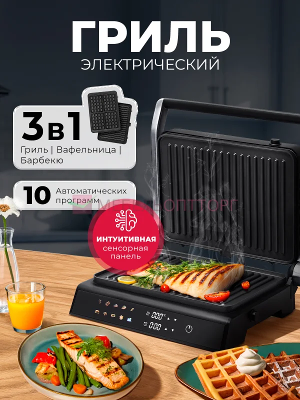 Гриль быстро и равномерно нагревается, обеспечивает нужную температуру приготовления для превосходной корочки снаружи и сочности внутри. Модель имеет 10 автоматических программ, в том числе для приготовления вафель. Сменные панели для них входят в комплект.