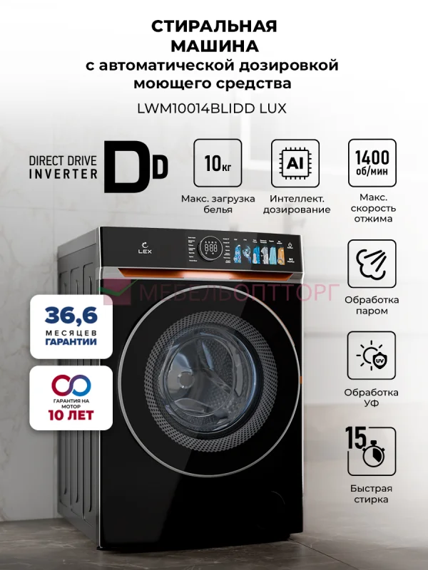 Стиральная машина с инвертором и паром LEX LWM10014BLIDD Lux / Отдельностоящий