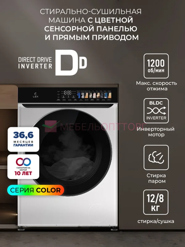 <p>Модель LEX LWM12812 color — это отдельностоящая стирально-сушильная машина с сенсорным управлением, доступная в черном и белом цветах. Важные преимущества:</p><ul><li style="font-weight: 400;" aria-level="1">Загрузка до 12 кг для стирки и до 8 кг для сушки: отлично подходит для больших семей.</li><li style="font-weight: 400;" aria-level="1">Индукционный нагрев: обеспечивает равномерное и эффективное высушивание.</li><li style="font-weight: 400;" aria-level="1">Steam Wash: пар помогает устранить пятна от сладостей, травы и краски, размягчает загрязнения и разглаживает одежду.</li><li style="font-weight: 400;" aria-level="1">Никелированное покрытие: защищает нагревательный элемент от накипи и ржавчины.</li></ul><p>Основные программы:</p><ul><li style="font-weight: 400;" aria-level="1">Умная стирка: интеллектуальный подбор параметров стирки.</li><li style="font-weight: 400;" aria-level="1">Пуховик: стирка с отжимом на низкой скорости для сохранения структуры утеплителя.</li><li style="font-weight: 400;" aria-level="1">Освежить: удаление запахов с вещей, которыми долго не пользовались.</li><li style="font-weight: 400;" aria-level="1">Гигиена: высокотемпературная стирка для устранения бактерий и аллергенов.</li><li style="font-weight: 400;" aria-level="1">Одеяло: объемные вещи, такие как одеяла, пледы, простыни, шторы, большие полотенца и т. п.</li><li style="font-weight: 400;" aria-level="1">Стирка + сушка 60’: полный цикл стирки и сушки всего за час.</li><li style="font-weight: 400;" aria-level="1">Быстрая стирка: ускоренная программа для стирки с отжимом за 15 минут.</li><li style="font-weight: 400;" aria-level="1">Шерсть: бережная стирка шерстяных вещей.</li><li style="font-weight: 400;" aria-level="1">Очистка барабана: автоматическая очистка от загрязнений и ворса.</li></ul>