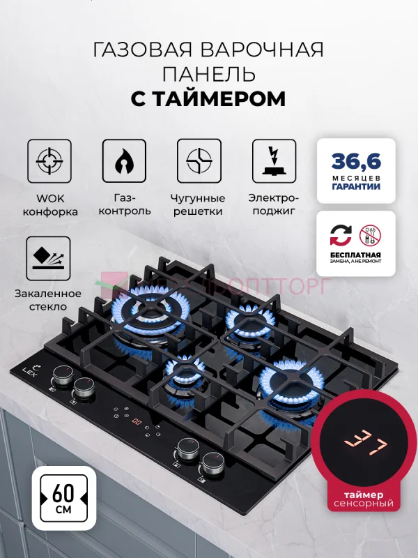 Варочная панель газовая с сенсорным таймером LEX GVG 646T BBL / Газовая варочная панель