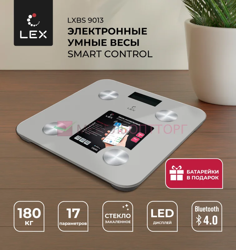 <p>Умные напольные весы LEX LXBS9013 сочетают в себе стильный дизайн и широкий функционал. Весы оборудованы высокочувствительными датчиками, которые мгновенно измеряют 17 основных биометрических параметров тела и вес с точностью до 100 граммов.Динамика всех параметров хранится в приложении в вашем смартфоне, помогая контролировать прогресс поддержания вашего тела в отличной форме. Приложение совместимо с iOS и Android. Для синхронизации со смартфоном реализована технология Bluetooth версия 4.0. Встроенная память позволяет хранить измерения до 8-ми пользователей. Качественное закаленное стекло толщиной 6мм легко в уходе и устойчиво к повреждениям. Весы способны выдерживать нагрузку до 180 кг. Автоматическое включение/выключение экономит заряд батареи. Прорезиненные ножки гарантируют устойчивое расположение на любом типе покрытия. Весы работают от 2 батареек типа АА. Батарейки включены в комплект поставки.Широкая цветовая линейка данной серии весов позволит вам без труда подобрать нужную модель под ваш интерьер. </p>
