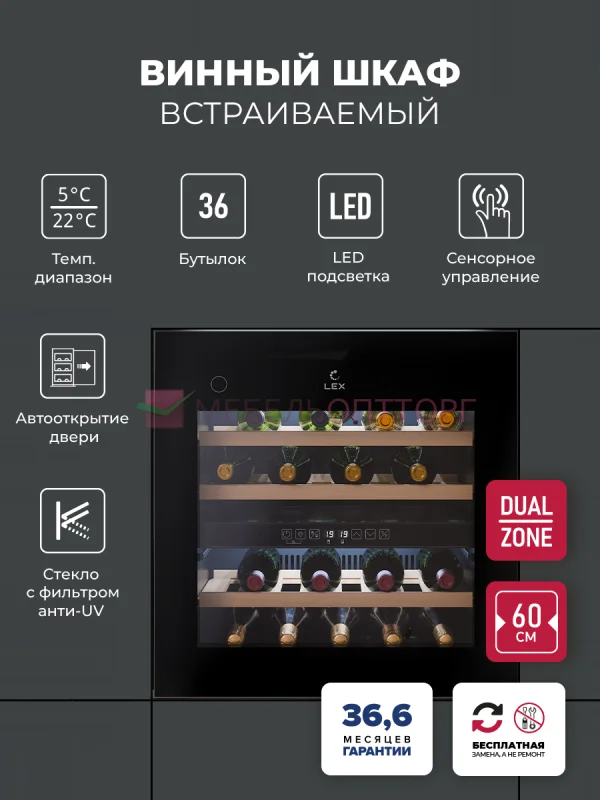 Винный шкаф встраиваемый LEX LWD6036BL dual zone PP / Встраиваемый