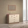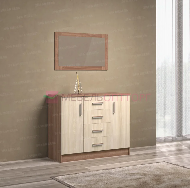 Имеет четыре выдвижных ящика и вместительные ниши за распашными дверцами.