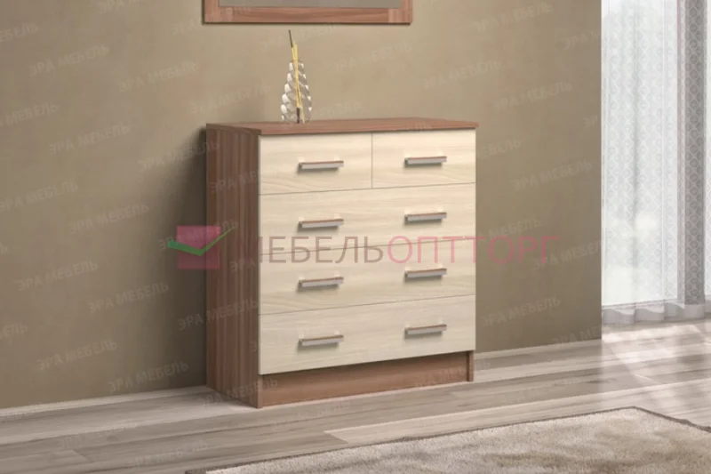 Комод оснащён пятью выдвижными ящиками (3 больших и 2 маленьких).